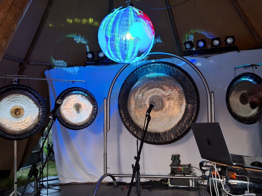 GAIA spiegelt sich im GONG. Installation auf New Healing Festival 2023 im Gong-Zelt Jens Zygars